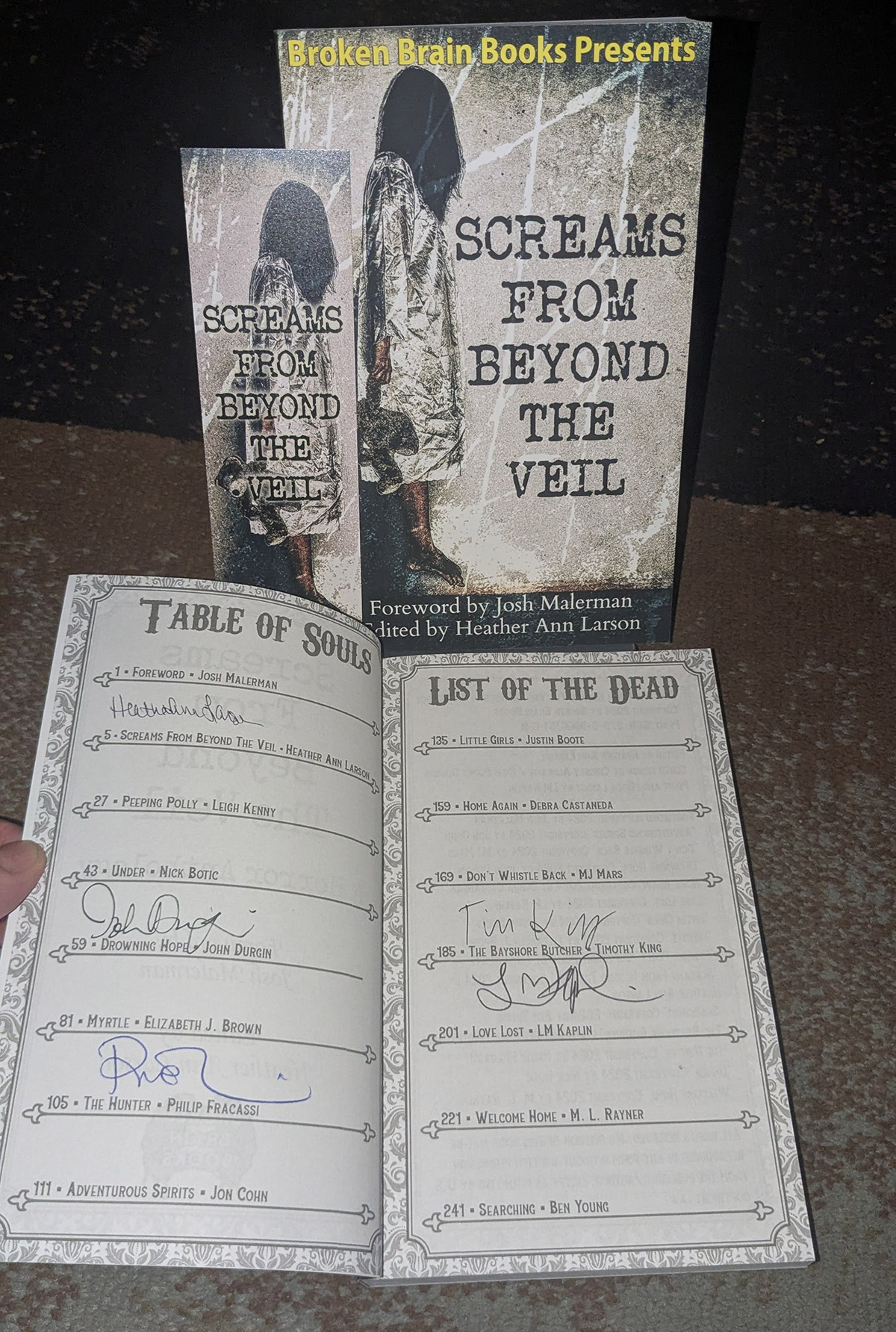 This bundle includes a paperback copy of Screams From Beyond The Veil signed by Philp Fracassi, John Durgin, Timothy King, Heather Ann Larson, and LM Kaplin + a bookmark + BBB sticker.