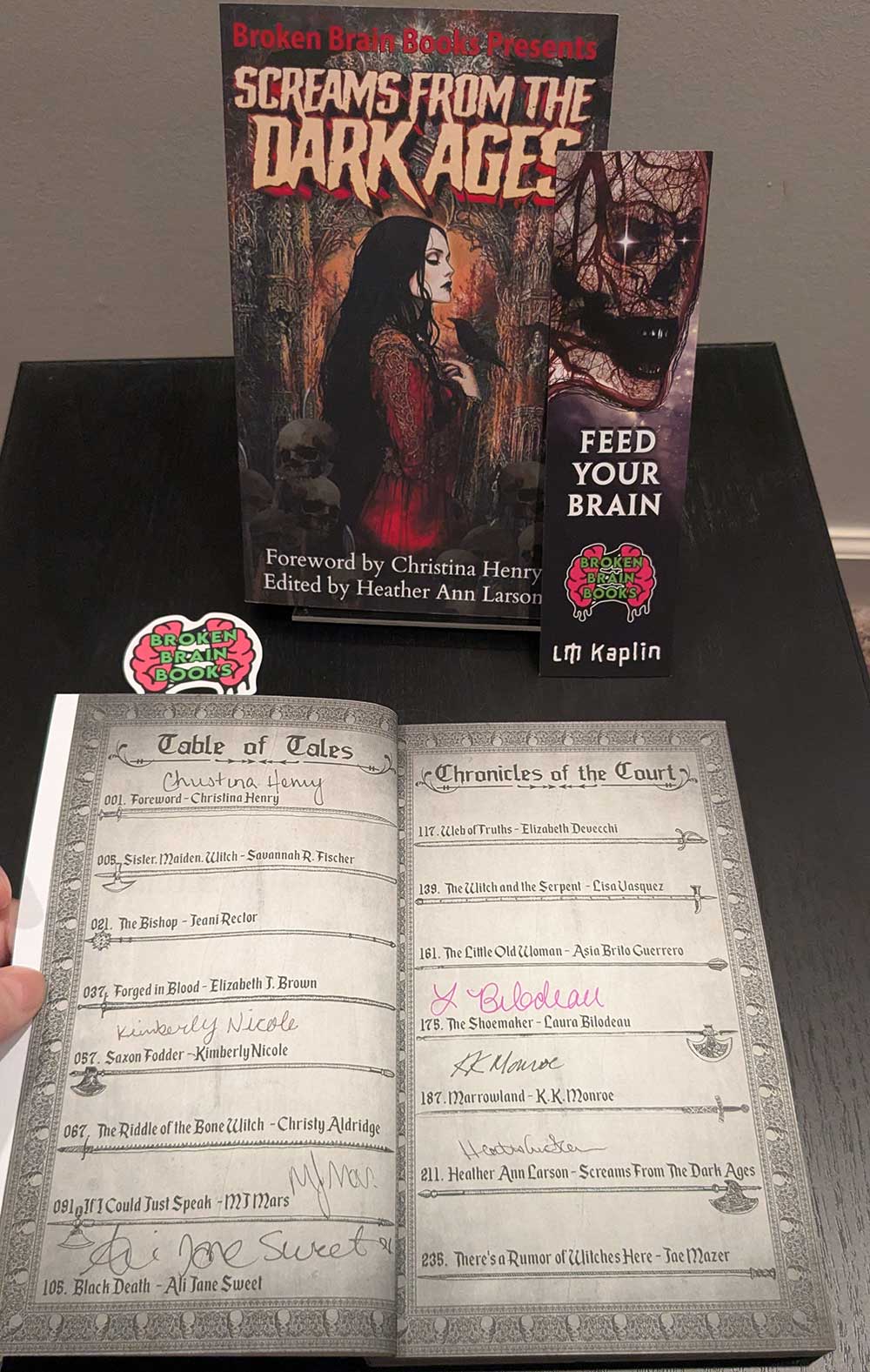 This bundle includes a paperback copy of Screams From The Dark Ages signed by Christina Henry, Heather Ann Larson, MJ Mars, Kimberly Nicole, Ali Jane Sweet, Laura Bilodeau, and KK Monroe. + a bookmark + BBB sticker.
